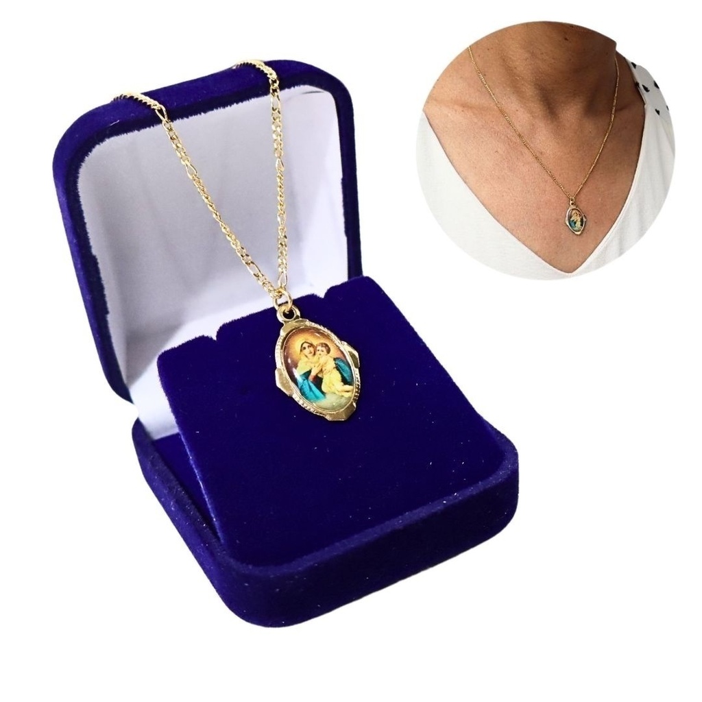 Colar em Ferro banhado a ouro e medalha Nossa Senhora Mãe e Rainha em Alumínio Resinado.