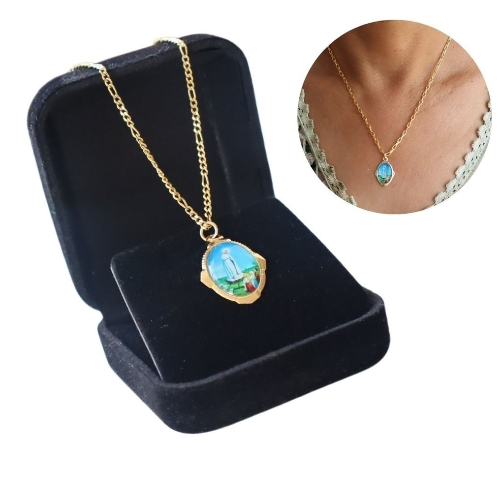 Colar em Ferro banhado a ouro e medalha Nossa Senhora de Fátima em Alumínio Resinado.