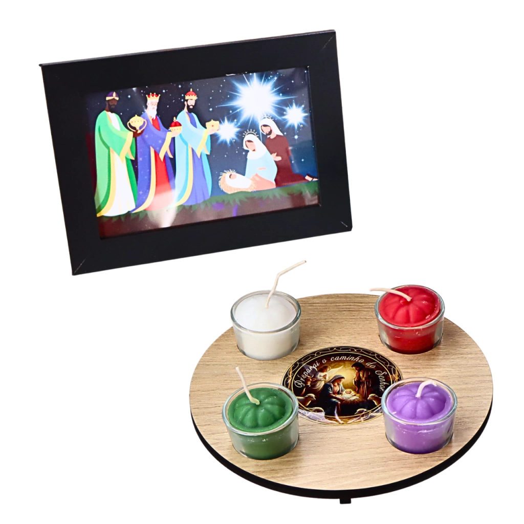 Kit com 4 (quatro) velas do advento em coroa MDF e vidro; 1 (um) Porta Retrato com imagem de Reis Magos com moldura Preta.